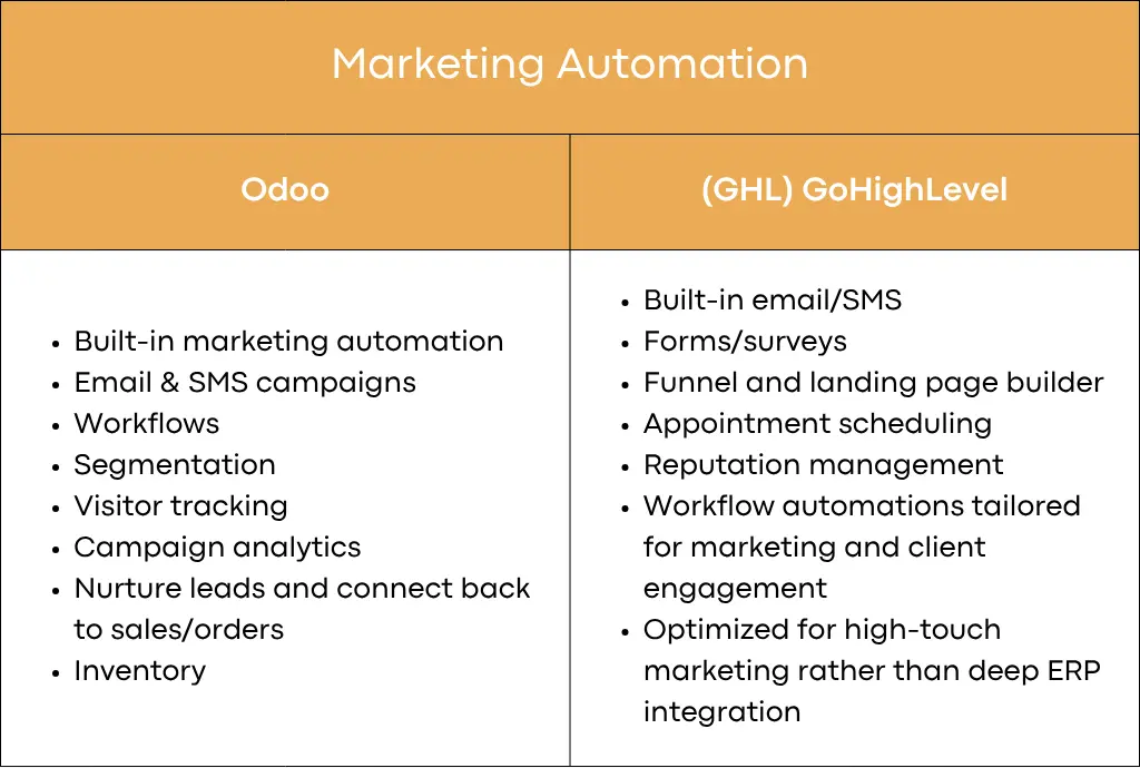 GHL has very strong marketing/funnel automation built from the marketing/agency side. Odoo also includes strong marketing automation but within a broader business operations platform.