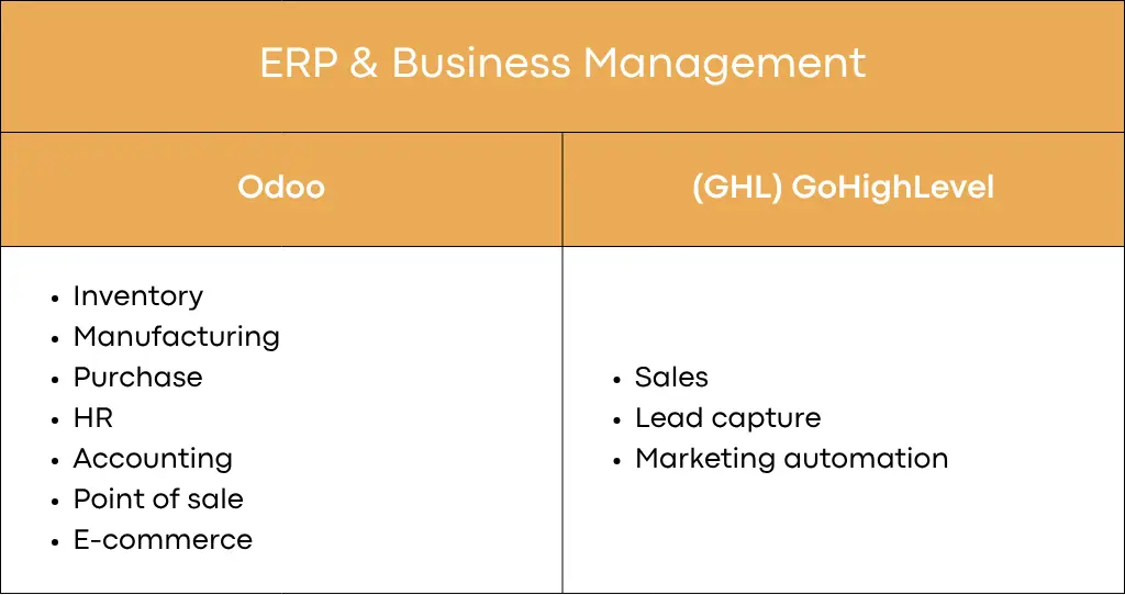 Odoo supports a wide range of modules and external integrations. For example, its Marketing Automation module connects to CRM, e-commerce, helpdesk, inventory. There is a module that integrates Odoo with GoHighLevel (sync contacts and leads/opportunities) via API.That means you can, in principle, run Odoo for core operations and still use GHL for marketing if desired.