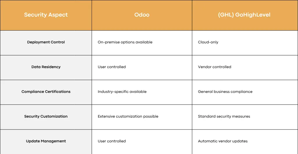 Businesses with strict compliance requirements or highly sensitive data typically prefer Odoo’s flexibility and control options. Organizations prioritizing ease of use and vendor-managed security find GHL’s approach more convenient and cost-effective.