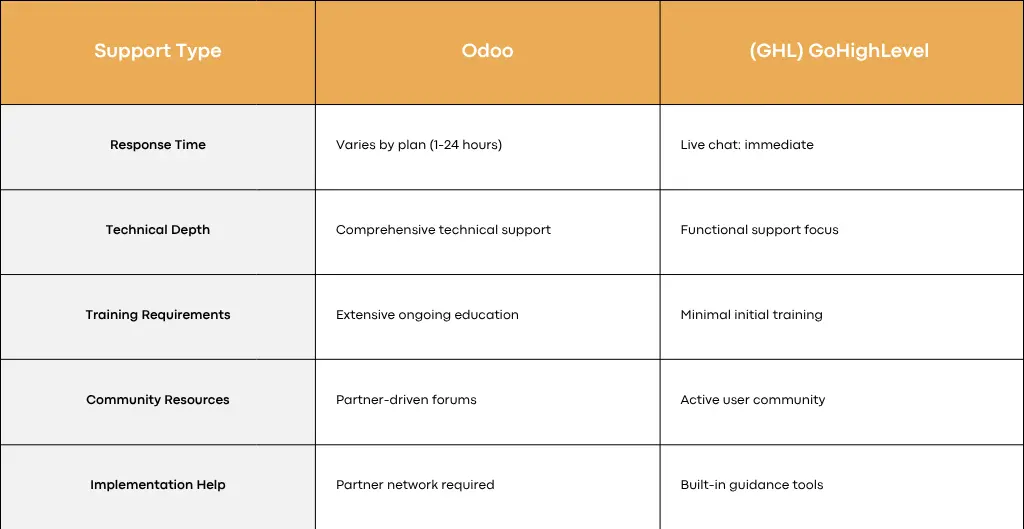 Organizations with technical teams or complex implementation requirements benefit from Odoo’s comprehensive educational resources and partner ecosystem. Businesses prioritizing rapid deployment and intuitive operation find GHL’s streamlined support approach more suitable for their needs.