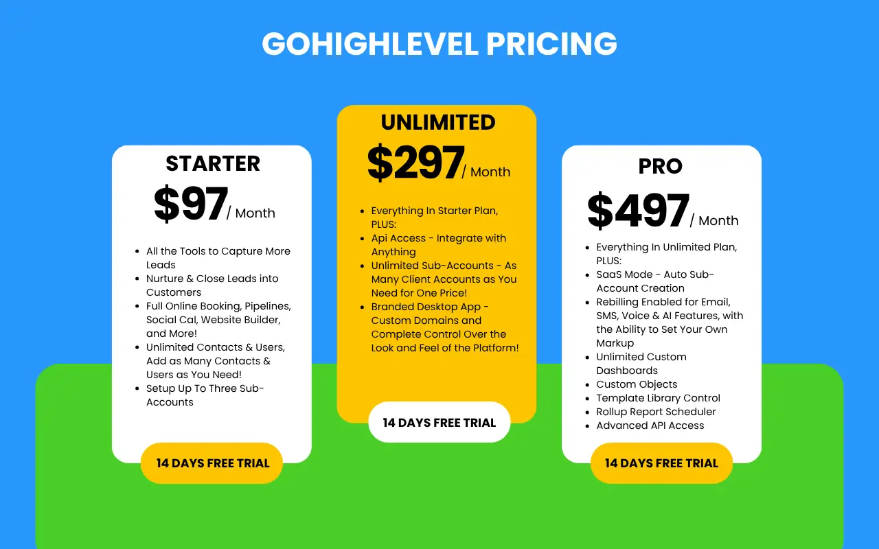 - SaaS/Agency Pro Plan: US$497/month – white-label mode, advanced features. Discounts for annual billing (approx 16.6%) available.
