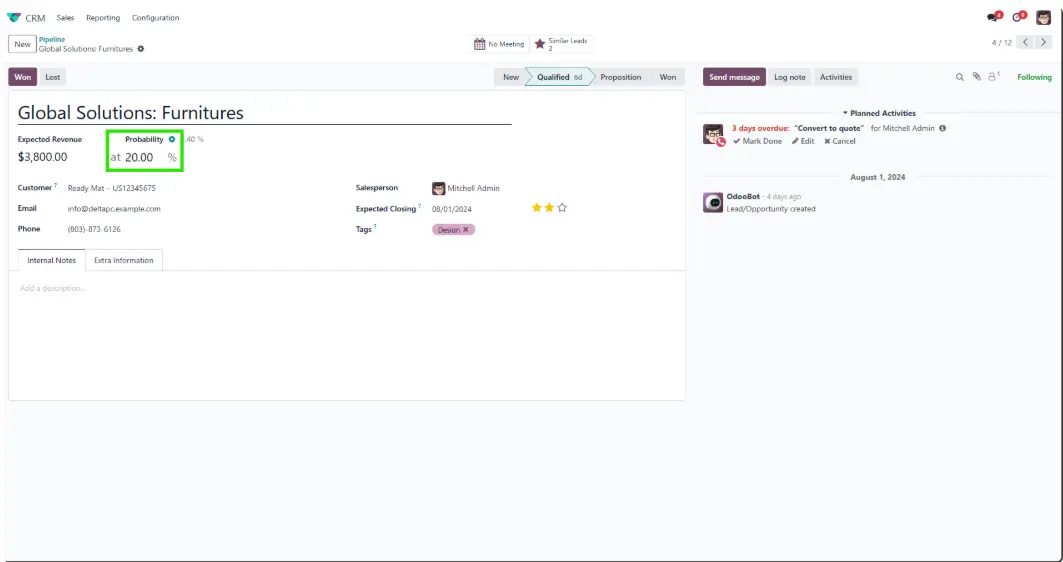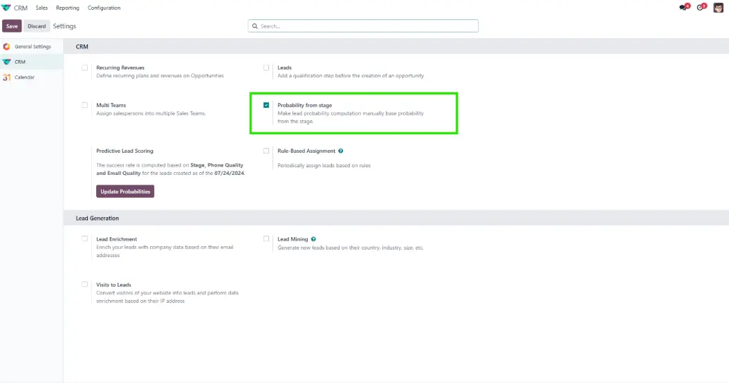 The CRM Probability From Stage module streamlines pipeline management for your sales team. You can configure probability percentages per stage to align with your sales cycle.