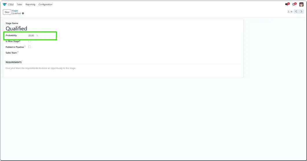 When an opportunity is moved into a stage, the module auto-updates its probability field based on that stage’s defined value.