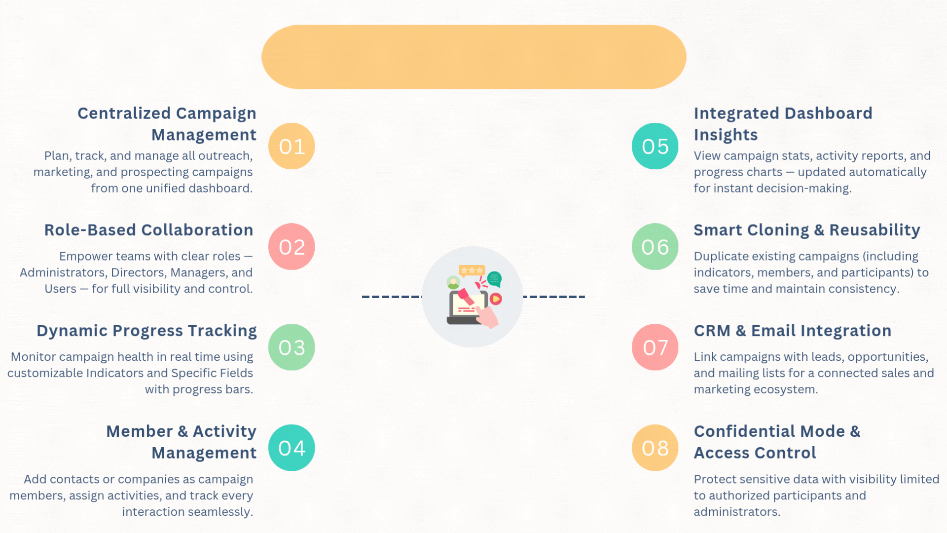 | Tracks marketing actions, participants, and ROI in one place. |