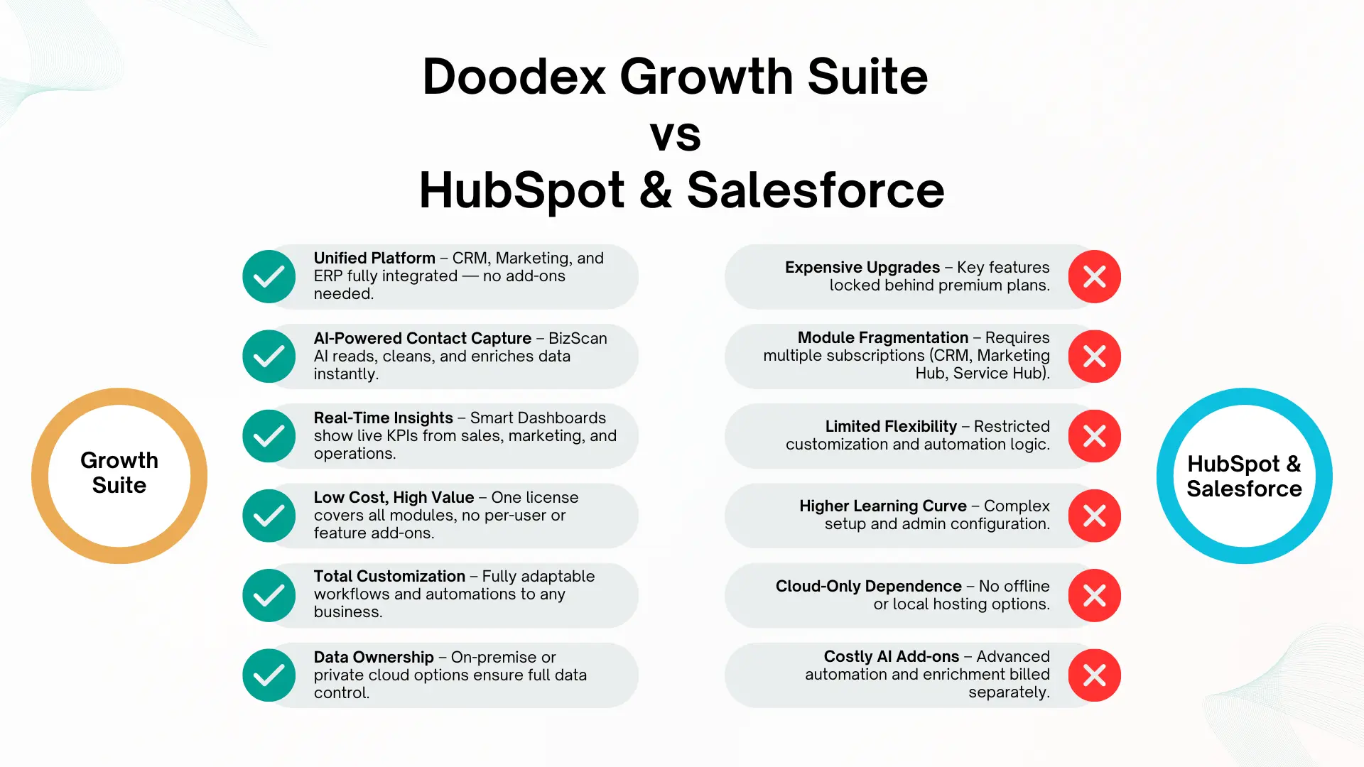 Unlike Salesforce or HubSpot, Doodex Growth Suite runs entirely inside Odoo — no need for third-party connectors or separate licenses.